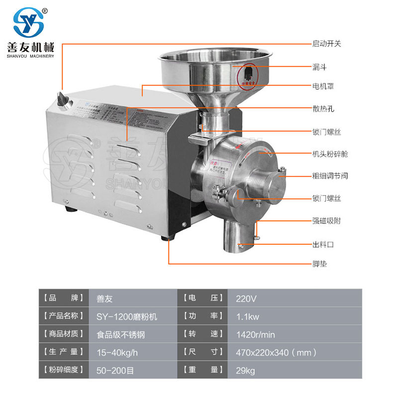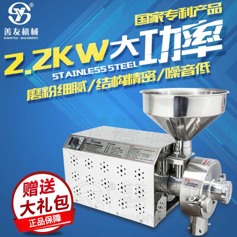 不同的行业选择不同的磨粉机磨盘的大小 影响磨粉机运作时出现的问题比喻卡机厉害 速度也达不到等一些问题,小型五谷杂粮磨粉机目前最大型号是250磨盘这种磨粉机主要针对商用型 或者超市店铺和流动式五谷杂粮现磨现卖比较实用的磨粉机,无论速度上精细方面对湿度高 中草药材那些比较坚硬的果和含油性的杂粮如核桃,枸杞,红枣,南瓜子,葵花籽,花生等 不会出现卡机磨坊方面同样达到精细度的效果,像善友机械五谷杂粮磨粉机,不像有些不锈钢磨粉机外 表光鲜艳丽内部结构仅仅是150磨盘,对于不懂机械的用户买到没有针对性的用途只能做到小的用途无法达到理想的效果和用途。
